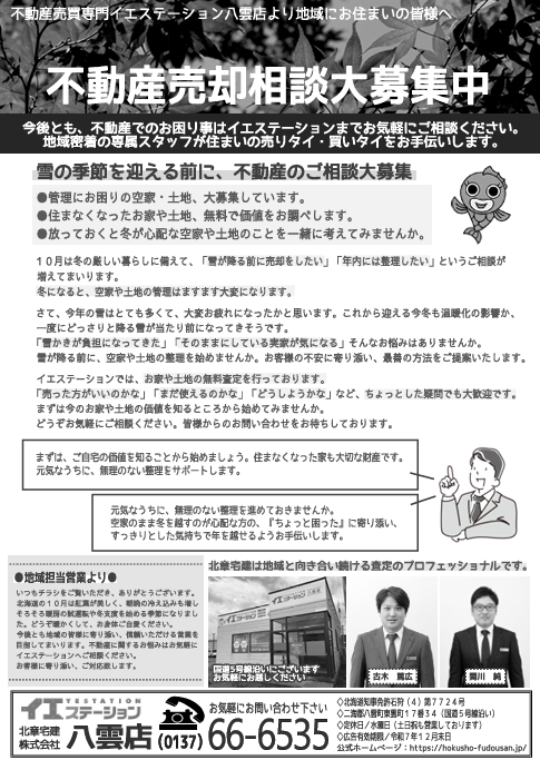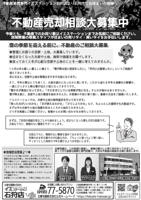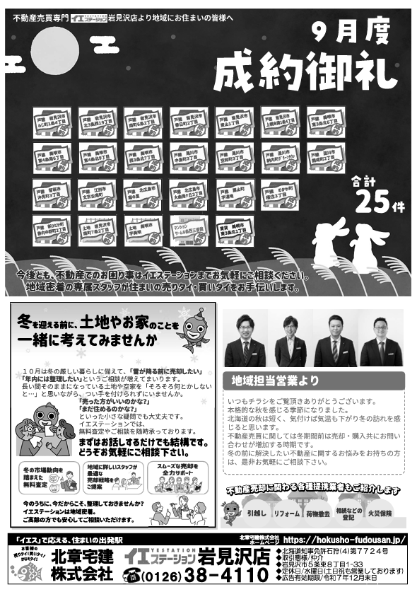 9月度も各店、多くのお客様とのご縁を頂きました。売主様・買主様、誠にありがとうございました。 不動産の売りタイ、買いタイや相続、査定のご相談はぜひイエステーション 北章宅建㈱まで。