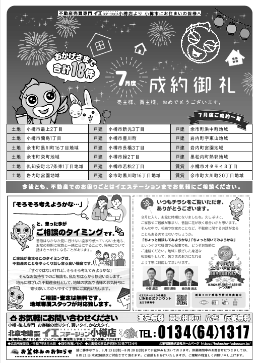 7月度も各店、多くのお客様とのご縁を頂きました。売主様・買主様、誠にありがとうございました。 不動産の売りタイ、買いタイや相続、査定のご相談はぜひイエステーション 北章宅建㈱まで。