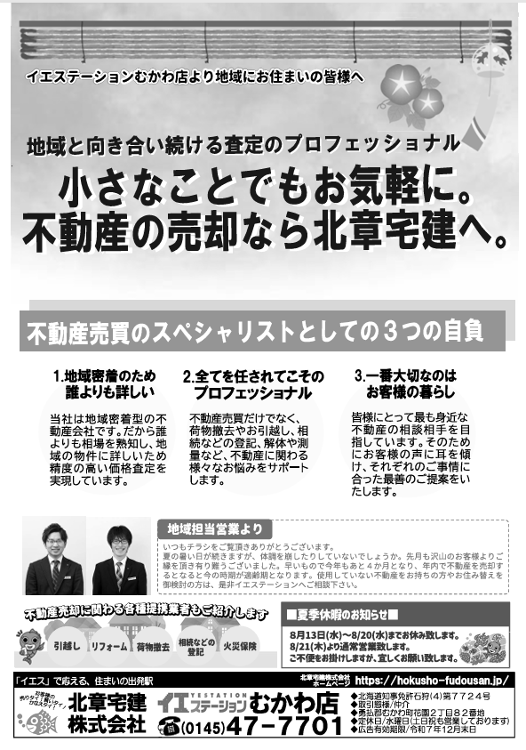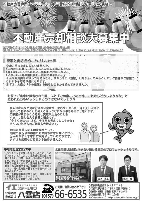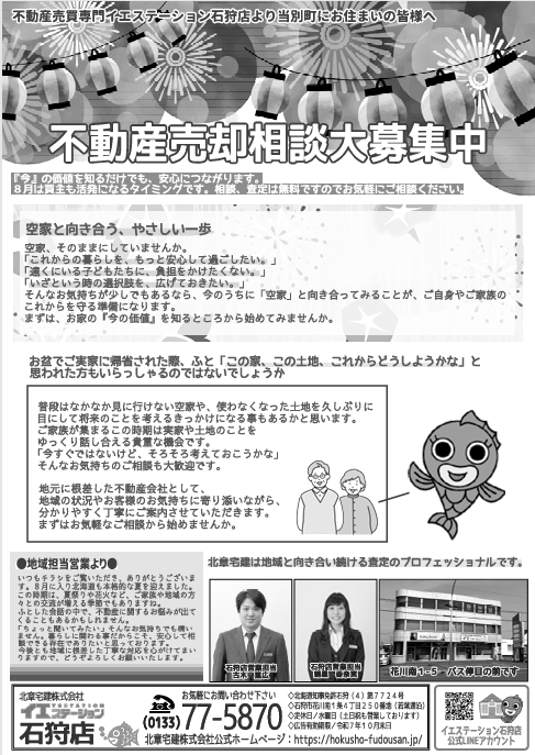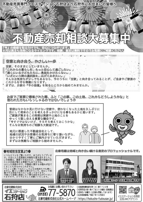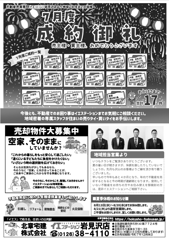 7月度も各店、多くのお客様とのご縁を頂きました。売主様・買主様、誠にありがとうございました。 不動産の売りタイ、買いタイや相続、査定のご相談はぜひイエステーション 北章宅建㈱まで。